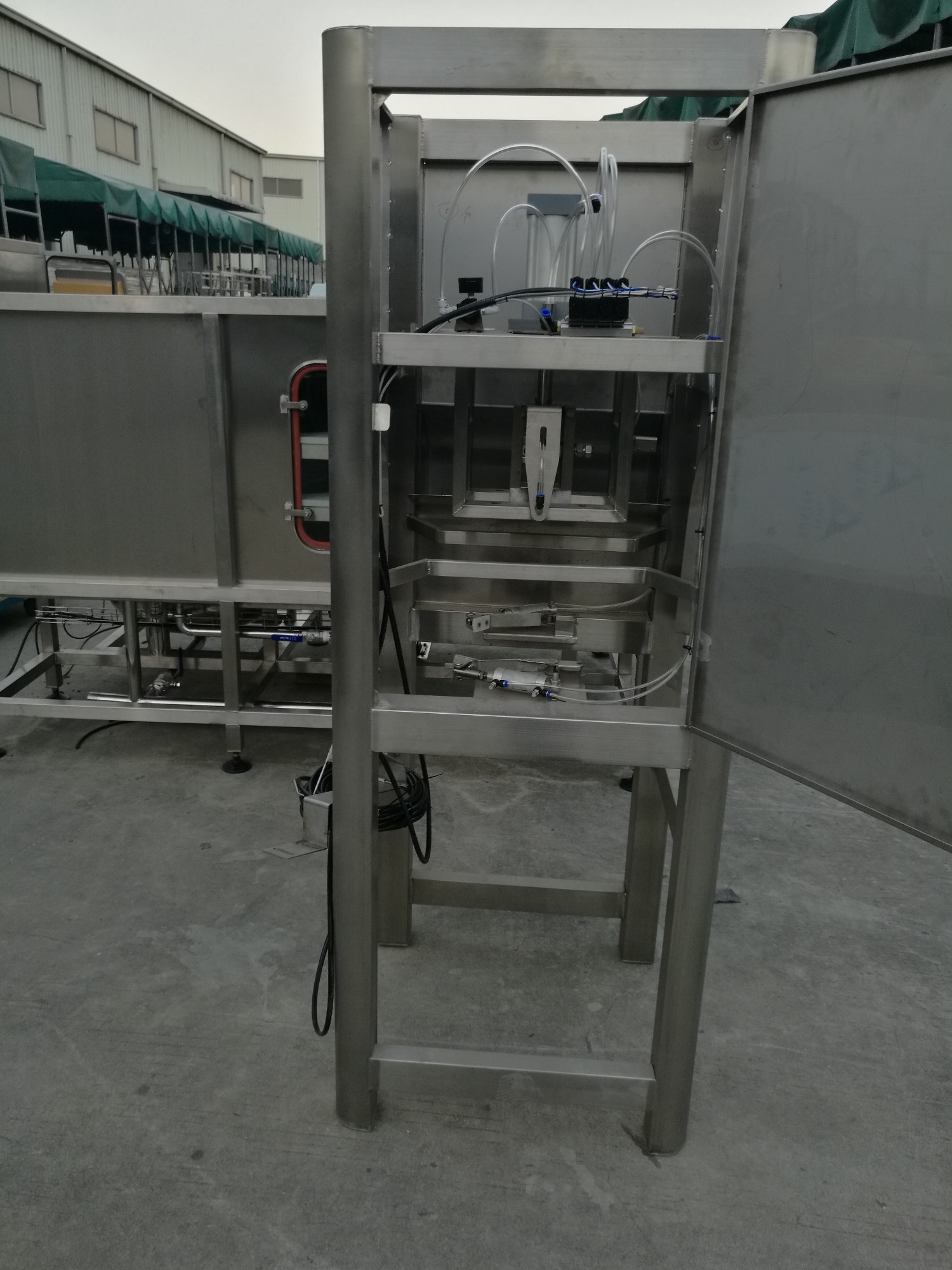 經(jīng)5米的輸送帶輸送入的桶將由機(jī)械手推入上桶機(jī),在電腦控制下,每次將2個(gè)5L桶同時(shí)送入一加侖內(nèi)沖洗機(jī),上桶機(jī)四周特設(shè)防塵安全保護(hù)罩。防止人和異物入侵。